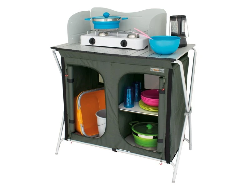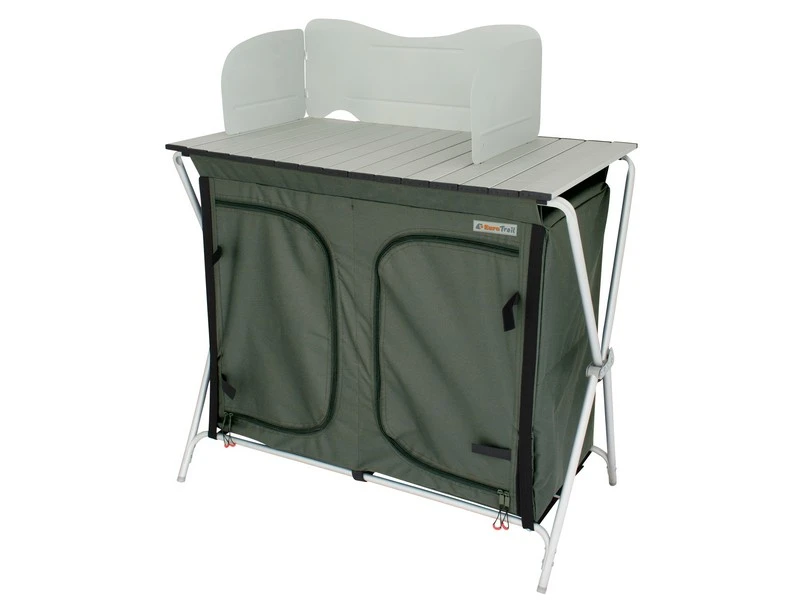 Grote opvouwbare kooktafel met aluminium top en windscherm. 1 ruim compartiment met 2 etages en 1 compartiment geschikt voor een krat met flessen. Inclusief opbergtas.