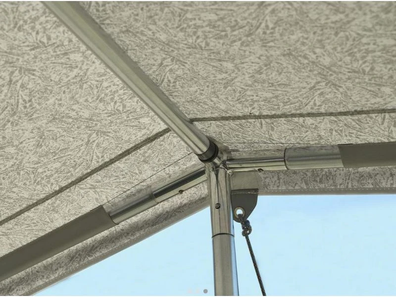 Met het Megaframe staat de Atlas luifel goed vast, ook bij wind en regen. Het is daarom de perfecte luifel voor seizoenskampeerders. De Atlas wordt gemonteerd aan de uitsteek van je voortent met behulp van 3 Mega F-links. Daarmee creëer je een terras met schaduw en een verdubbeling van het overdekte oppervlak.