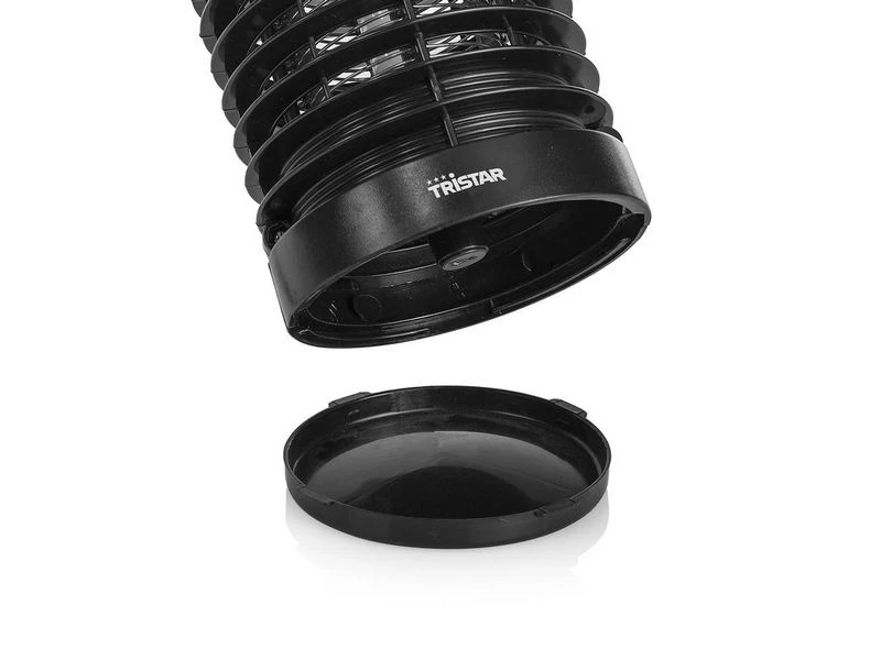 De handige Tristar muggenlamp heeft een buis met 4 Watt UV licht die alle soorten vliegende insecten aantrekt. Vervolgens vliegen ze tegen het spanningsrooster van 800-1000 volt aan en vallen ze in het afneembare opvangbakje. Op deze manier kan je alle gedode insecten makkelijk en hygiënisch opruimen. Met het meegeleverde reinigingsborsteltje maak je ook eenvoudig de lamellen van de lamp schoon.